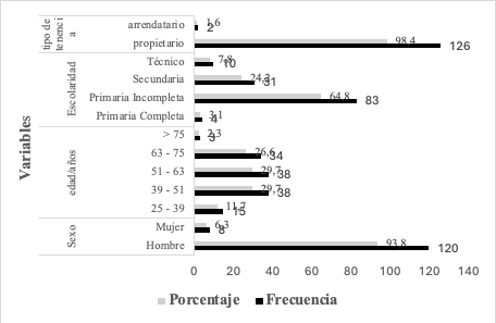 La investigación se realizó en 13 comunidades de la zona de Miraflor, Estelí, con una muestra de población de 128 productores y productoras, en este sentido la figura uno se presentan características generales encontradas en este grupo de población donde el 94 % son hombres, la edad promedio esta en rango de 25 a 63 años, en relación al nivel académico alcanzado la mayoría tiene un nivel de primaria incompleta alcanzado por el 65%, en relación al tipo de tenencia de la tierra, la mayor parte de esta población en estudio son propietarios de sus tierras.