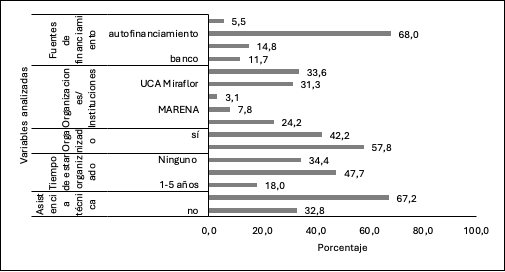 Estudios similares realizados por Bermúdez Cardona (2007), En el Municipio de Cuá Bocay-Jinotega Nicaragua, la población en estudio el 47.7% reciben asistencia técnica. el 16.7% pertenece a asociaciones de productores. En relación a acceso a financiamiento (Blandón Calderón y otros, (2025) encontró que el financiamiento al sector agrícola, Municipio de Cusmapa – Madriz Nicaragua es limitado, dado a que estos rubros son poco atractivos para este sector sobre todo el de granos básicos.
