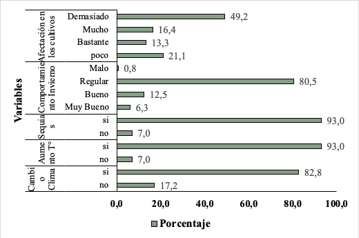 En la figura cuatro relacionado a la percepción que tienen los productores sobre el clima se analizó cinco variables, en cuanto al comportamiento del clima en los últimos cinco años, el 83% expresaron que el clima ha cambiado en sus comunidades, esto ha estado relacionado con aumento de T° a la vez sequias prolongadas, un 93% lo percibe así, en cuanto a los comportamientos de las precipitaciones en temporada de invierno los resultados expresan que el 80% ha sido regular, afectando en un 49% el desarrollo o establecimiento de los cultivos.