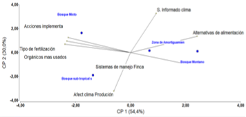 En la figura siete se hace énfasis en un análisis de componentes principales expresado en CP1, donde se explica el 54,4% de la varianza total, y el CP2 el 30,0% de la varianza total. Ambos componentes representan un 84.4% de la variabilidad de los datos, con una muy buena representación en su agrupamiento. El Bosque mixto incluye las comunidades de (La Pita, el Coyolito y el Terrero) este está asociado a las diferentes prácticas de adaptación que son las acciones implementadas, tipo de fertilización y uso de fertilización orgánica.