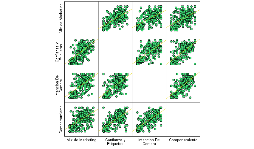 La tabla 4 muestra la correlación Rho de Spearman que existe en las dimensiones y entre sí mismas, el método fue utilizado ya que no existían normalidad en los datos presentados. Se observa que existen correlaciones positivas y significativas en todas las dimensiones existentes (p < 0,01), lo cual afirma que existen relaciones directas entre las variables. Entre las relaciones sobresale una fuerte correlación entre Intención de Compra y Comportamiento (p=0,702), lo que explica que al tener un mayor deseo de adquirir algo verde, eso dirige a un comportamiento más responsable. De igual manera la Confianza y Etiqueta cuentan con una alta correlación junto a la Intención de Compra (p=0,680), recalca que es muy importante la realidad y veracidad de la información ambiental. Al contrario del Mix de Marketing que tiene una correlación moderada con el resto de las dimensiones (p=0,514 y 0,606), indicando la influencia que esta dimensión tiene ante las decisiones de compra. Todas estas variable y dimensiones son estrategias del marketing verde que indican que hay aspectos que influyen directamente y otros indirectamente a que los consumidores tomen una decisión de compra.