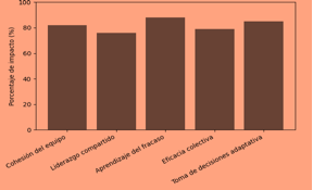 Por otro lado, la cohesión del equipo (82 %) y la eficacia colectiva (79 %) se consolidan como pilares fundamentales en la construcción de decisiones compartidas y efectivas. Aunque el liderazgo compartido presenta un porcentaje ligeramente menor (76 %), sigue siendo un factor determinante para distribuir la responsabilidad y favorecer la confianza grupal. En conjunto, los datos demuestran que cuando los equipos integran cohesión, aprendizaje del error y liderazgo distribuido, los fracasos dejan de ser obstáculos y se convierten en verdaderas fuerzas impulsoras para la mejora continua y el logro de objetivos colectivos.
