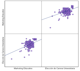 Si bien estos puntos bien no se distribuyen de una forma que es perfectamente lineal, lo cual es asimismo coherente ya con la naturaleza social y de forma perceptiva de las variables que son estudiadas, así la orientación general del gráfico que nos evidencia a una asociación que es directa entre ambas. La dispersión moderada nos refleja que, aunque este marketing educativo no es el único factor que por si interviene en la decisión académica de estos estudiantes, sí representan un elemento que es relevante dentro de un conjunto de factores que si influyen en este dicho proceso. Por tanto, nuestro gráfico confirma que visualmente si existe lo que es una relación consistente entre estas variables, alineándose así con los resultados obtenidos en este análisis de correlación Rho de Spearman. Como consecuencia, esta representación gráfica nos refuerza la interpretación estadística, al mostrarnos de manera clara que el marketing educativo nos ejerce una influencia que es significativa en la elección de una carrera universitaria. Este comportamiento nos indica de forma visual y respalda la aceptación de una hipótesis planteada en esta investigación y así evidencia la importancia de estrategias de comunicación institucional, como una imagen universitaria y así el contenido informativo en lo que es la toma de decisiones académicas por parte de los estudiantes.