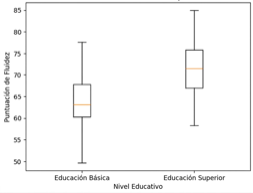 La gráfica de caja y bigotes presentada anteriormente muestra la distribución de los puntajes de fluidez en ambos niveles educativos, en esta representación se observa que los estudiantes de educación superior presentan una mediana más alta y una menor dispersión en los resultados, lo que indica un desempeño lingüístico más consistente; por otro lado, el grupo de educación básica presenta mayor variabilidad en los puntajes, lo que refleja diferencias individuales en el proceso de adquisición del idioma.