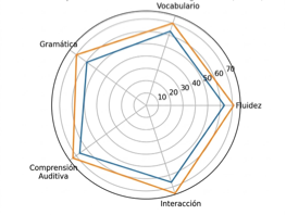 Adicionalmente, la gráfica de radar permite visualizar de manera comparativa el desempeño promedio en las diferentes habilidades lingüísticas evaluadas, en esta representación se observa que el grupo de educación superior alcanza niveles más altos en todas las dimensiones analizadas; no obstante, la forma general de ambas figuras es similar, lo que sugiere que el desarrollo de habilidades sigue un patrón comparable en ambos niveles educativos.