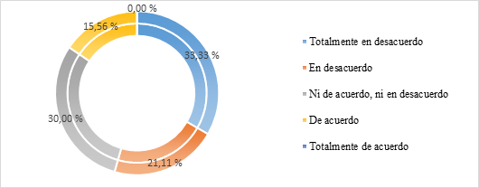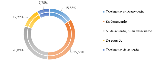 En cuanto a la pregunta: ¿el docente evalúa todo el proceso, no solo el producto final?, los académicos dan las siguientes respuestas: el 33,33 % de encuestados mencionan estar totalmente en desacuerdo; el 21,11 %, en desacuerdo; el 30 %, ni de acuerdo ni en desacuerdo, y el 15,56 %, de acuerdo. No hay educandos que estén totalmente de acuerdo.
