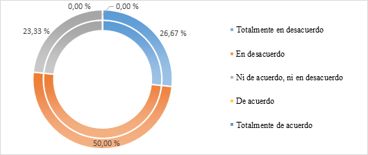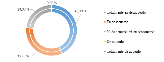 En la interrogante, ¿en clase el docente emplea recursos tecnológicos?, los resultados fueron los siguientes: el 43,33 % de estudiantes dice estar totalmente en desacuerdo, el 3,33 % señala estar en desacuerdo, el 23,33 % afirma estar ni en desacuerdo ni de acuerdo. No hay educandos que estén de acuerdo o totalmente de acuerdo.