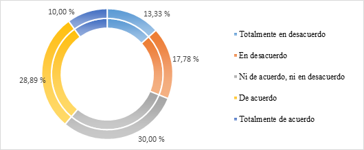 Acerca de la interrogante: ¿el docente organiza las clases con relación al tema de estudio y al tiempo establecido?, los estudiantes supieron manifestar lo siguiente: el 13,33 % de ellos está totalmente en desacuerdo; el 17,78 %, en desacuerdo; el 30 %, ni de acuerdo, ni en desacuerdo; el 28,89 %, de acuerdo, y el 10 %, totalmente de acuerdo.