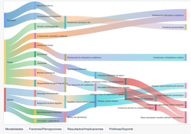 Los docentes, por su parte, destacaron que el entorno híbrido facilita estrategias pedagógicas diversificadas, permitiendo integrar recursos digitales complementarios, retroalimentación inmediata y actividades colaborativas en línea; sin embargo, también señalaron que la carga de planificación y la adaptación metodológica son mayores, especialmente cuando deben diseñar recursos diferenciados para cada modalidad.