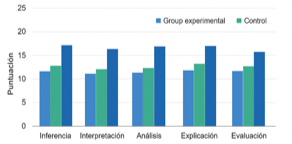Se analizaron las puntuaciones de pensamiento crítico de los estudiantes antes y después de la intervención educativa. La Tabla 1 muestra los promedios y desviaciones estándar para las dimensiones de pensamiento crítico (inferencia, interpretación, análisis, explicación y evaluación) en ambos grupos.