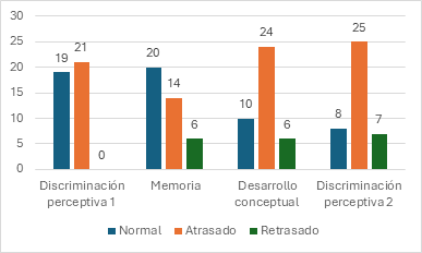 Los datos facilitan identificar que, en la subárea de Discriminación perceptiva 1, la mayoría de los niños se ubican en el rango de atraso, de manera similar en las subáreas de Desarrollo conceptual y discriminación perceptiva 2; en cuanto a la subárea Memoria, la mitad de los niños se ubican en el rango de atraso y retraso.