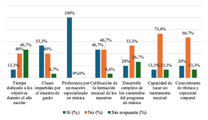 En la figura 1 se destaca la perspectiva desde los ítems “sin respuesta”, los resultados reflejan ciertos niveles de incertidumbre o falta de información por parte de los encuestados respecto a varios aspectos del programa de música. El ítem con mayor omisión (46.7 %) corresponde al tiempo dedicado a los objetivos durante el año escolar, lo que podría interpretarse como una falta de claridad sobre la planificación o el seguimiento del cumplimiento de dichos objetivos. De igual modo, el desarrollo completo de los contenidos del programa de música presenta un 26.7 % sin respuesta, lo que sugiere que una parte significativa de los participantes no tiene conocimiento suficiente sobre la implementación curricular o no percibe evidencias claras de su ejecución. Estas omisiones pueden indicar una limitada comunicación institucional o una escasa participación de la comunidad educativa en el proceso de enseñanza musical.