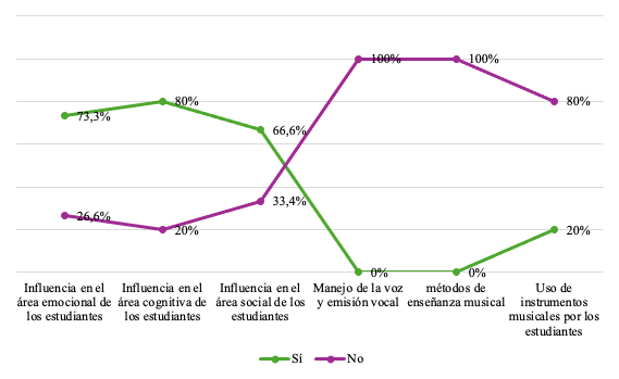 En cuanto a la percepción sobre la importancia de la música en la educación, todos los maestros encuestados coincidieron en que la educación musical realiza importantes aportes al campo educativo, tanto a nivel cognitivo como emocional. Específicamente, el 80% de los participantes indicó que la música contribuye significativamente al desarrollo del área cognitiva de los estudiantes, mientras que un 66.6% mencionó que también fomenta el desarrollo social. Este reconocimiento de la relevancia de la educación musical contrasta con la falta de implementación efectiva de esta disciplina.