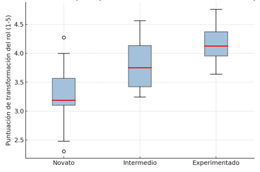 En la cuantificación de la percepción sobre la transformación del rol docente (escala 1–5), se establecieron tres grupos por experiencia profesional: Novato, Intermedio y Experimentado; los docentes experimentados mostraron medianas más altas y menor dispersión en su percepción de transformación, indicando mayor consolidación de prácticas facilitadoras y confianza en la mediación tecnológica.