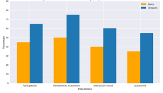 Los resultados muestran incrementos que oscilan entre 20 y 23 puntos porcentuales en todos los indicadores evaluados, siendo el rendimiento académico el que reflejó el cambio más notable, este ascenso se asoció principalmente a la inclusión de recursos multisensoriales y la supervisión personalizada, estrategias que facilitaron un mayor nivel de autonomía y comprensión por parte de los estudiantes.