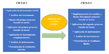 La propuesta metodológica es una secuencia didáctica dividida en dos proyectos basados en tareas, cada uno correspondiente a un ciclo de la investigación.