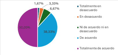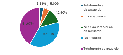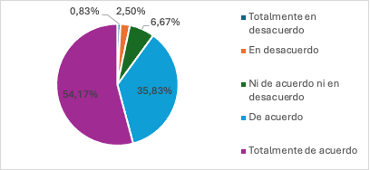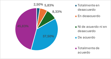 Por otro lado, un 12,5% (15 estudiantes) expresó una posición neutral al indicar que están “Ni de acuerdo ni en desacuerdo”, mientras que un 5% (6 estudiantes) afirmó estar “En desacuerdo”. Además, un porcentaje del estudiantado siendo solo un 3,33% (aproximadamente 4 discentes) señaló estar “Totalmente en desacuerdo” con la afirmación.