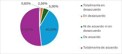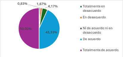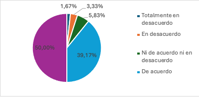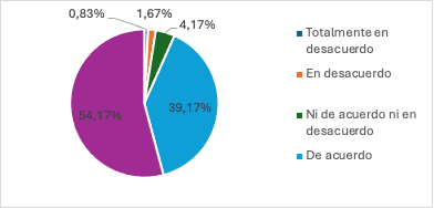 Por otro lado, un pequeño porcentaje de los participantes se mostró más neutral o en desacuerdo: un 4,17% (5 estudiantes) seleccionó la opción “Ni de acuerdo ni en desacuerdo”, mientras que un 1,67% (2 encuestados) y un 0,83% (1 estudiante) manifestaron estar “En desacuerdo” y “Totalmente en desacuerdo”, respectivamente.