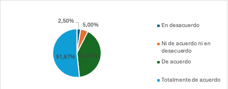 En cuanto a posturas más neutrales o negativas, un 6,67% (8 estudiantes) indicó estar “Ni de acuerdo ni en desacuerdo”, mientras que un 2,5% (3 estudiantes) y un 0,83% (1 encuestado) señalaron estar “En desacuerdo” y “Totalmente en desacuerdo”, respectivamente.