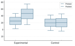 El análisis de la dispersión revela que las desviaciones estándar de las mediciones (pre y post) fueron moderadas (SD pre ≈ 7–8; SD post ≈ 9–10), lo que sugiere variabilidad individual esperable en contextos educativos. No obstante, la magnitud de la ganancia media en el grupo experimental supera con creces la heterogeneidad observada, lo cual refuerza la relevancia educativa del hallazgo.