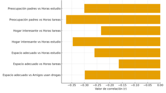 El análisis de correlación de Pearson permitió identificar diversas asociaciones negativas entre las variables académicas, familiares y sociales evaluadas. Estas correlaciones negativas indican que, a medida que una variable aumenta, la otra tiende a disminuir. Aunque en su mayoría son de magnitud débil, aportan información relevante para comprender los factores asociados al desempeño académico. Se observaron relaciones negativas entre las condiciones del hogar y el tiempo dedicado al estudio. Contar con un espacio adecuado para realizar actividades presentó correlaciones inversas con las horas dedicadas a tareas (r = -0.164) y al estudio para evaluaciones (r = -0.260), lo cual sugiere que la infraestructura familiar no garantiza una mayor dedicación académica. De manera similar, considerar el hogar como un lugar donde se abordan temas interesantes mostró correlaciones negativas con las horas de estudio (r = -0.346) y con las horas de tareas (r = -0.234), indicando que un ambiente intelectualmente estimulante no se traduce necesariamente en hábitos de estudio más desarrollados.