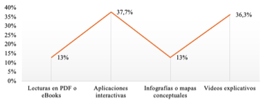 La Figura 1 muestra las preferencias que los jóvenes adultos tienen para estudiar formatos de contenido para el aprendizaje digital. Se observa una marcada inclinación hacia recursos interactivos y audiovisuales, siendo las aplicaciones interactivas las más valoradas con un 37.7%, seguidas muy de cerca por los videos explicativos con un 36.3%. En contraste, los formatos más tradicionales como las lecturas en PDF o eBooks, así como las infografías o mapas conceptuales, obtuvieron solo un 13% de preferencia cada uno.