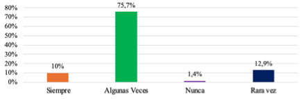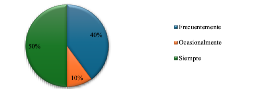 La figura 2 muestra la frecuencia con la que los adultos jóvenes utilizan herramientas tecnológicas para apoyar el aprendizaje académico. El 50% de los encuestados indicó que siempre lo hace, mientras que un 40% afirmó hacerlo frecuentemente. Solo un 10% señaló que lo hace ocasionalmente.