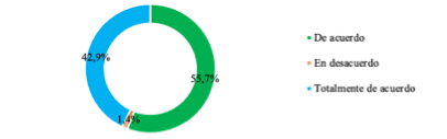 La Figura 3 refleja las percepciones sobre el impacto del uso de la tecnología en la capacidad de aprender de forma autónoma. La gran mayoría de los encuestados manifestó una valoración positiva: el 55.7% está de acuerdo y el 42.9% está totalmente de acuerdo con que la tecnología favorece este tipo de aprendizaje. Solo un 1.4% expresó estar en desacuerdo, lo que evidencia un consenso casi unánime respecto al papel positivo que desempeñan las herramientas tecnológicas en el fortalecimiento de la autonomía en el proceso de aprendizaje.