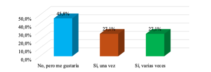 La Figura 5 muestra la medida en que los adultos jóvenes encuestados ha participado en cursos, talleres o capacitaciones en línea fuera del ámbito de los estudios formales. El 45.8% de los encuestados indicó que no ha participado, pero le gustaría hacerlo, lo que revela un interés significativo por la formación complementaria en línea. Por otro lado, un 27.1% señaló que ha participado una vez, y otro 27.1% que lo ha hecho en varias ocasiones.