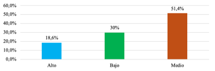 La figura 7 sobre la percepción del nivel de apoyo que ofrece la universidad para desarrollar competencias digitales revela que la mayoría de los encuestados (51.4%) considera que dicho apoyo es de un nivel medio. Un 30% lo percibe como bajo, mientras que solo un 18.6% lo califica como alto. Estos datos indican que, aunque existe cierta presencia institucional en el desarrollo de competencias digitales, aún hay oportunidades de mejora para fortalecer el respaldo que la universidad brinda en este ámbito clave para la formación académica y profesional.