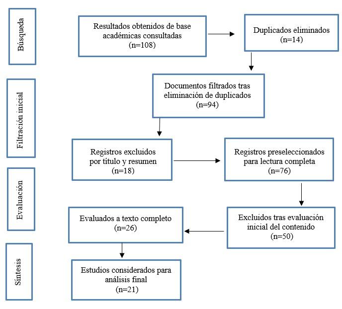 El proceso metodológico se desarrolló en las siguientes fases: (1) delimitación del problema y formulación de la pregunta de investigación; (2) definición del protocolo de búsqueda; (3) elección de las bases de datos académicas mencionadas; (4) aplicación de criterios de inclusión y exclusión; (5) lectura detallada y análisis de contenido temático; (6) elaboración del diagrama de flujo PRISMA; y (7) sistematización de la información mediante tablas que visibiliza el proceso de selección.