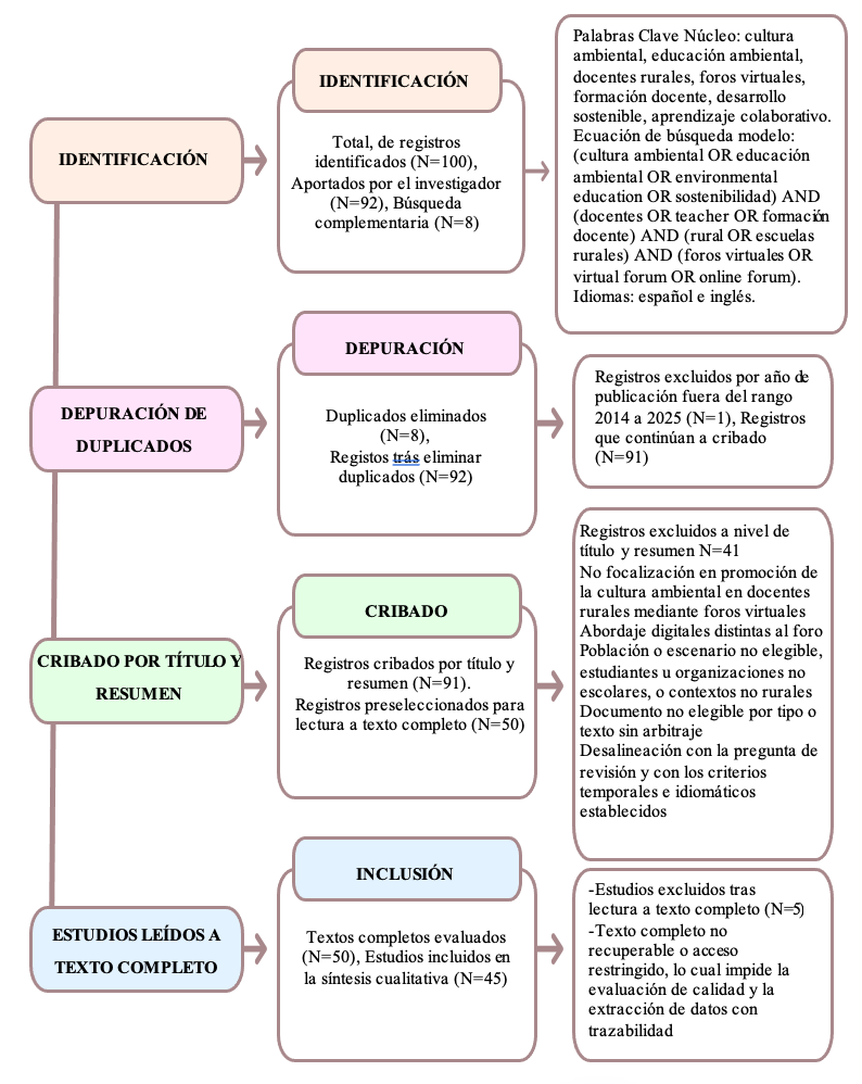 A partir de esta búsqueda, se obtuvo un total de 35 estudios relacionados con la temática del artículo, los cuales fueron publicados en un periodo que abarca desde el año 2021 hasta el año 2025. De manera práctica, la revisión documental se orientó a sintetizar evidencia sobre la promoción de la cultura ambiental en docentes de instituciones educativas rurales del municipio de Cereté Córdoba, considerando los foros virtuales como mediación para el intercambio formativo, la construcción de acuerdos pedagógicos y la circulación de prácticas orientadas al cuidado del entorno, por consiguiente se adoptó el método Prisma como guía de reporte y como mecanismo de control de decisiones, a partir de ello se fijaron criterios de inclusión y exclusión para delimitar tipologías documentales y pertinencia temática, luego se ejecutó un proceso secuencial de identificación, depuración, cribado y elegibilidad, con registro explícito de motivos de exclusión, en consecuencia el corpus final quedó dispuesto para una síntesis cualitativa sustentada en extracción sistemática de información y categorización temática, asegurando trazabilidad entre decisiones metodológicas y evidencia seleccionada.