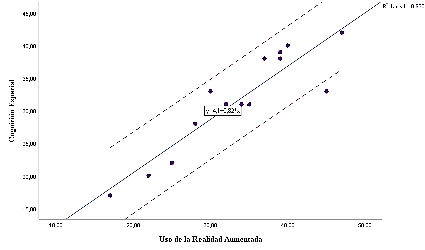 En la fig. 2 de dispersión se puede verificar gráficamente que existe una correlación lineal positiva fuerte entre las variables en estudio. La línea de regresión obtenida es , lo que significa que por cada punto que aumente la frecuencia e intensidad de uso de la RA, la capacidad de cognición espacial del estudiante aumenta en 0,82 puntos. Además, el coeficiente de determinación  lineal de 0,820 indica que la utilización de la RA justifica el 82% de la variabilidad en el desarrollo de habilidades espaciales de los estudiantes, quedando solo un 18% a factores externos. Los puntos de datos se agrupan estrechamente alrededor de la línea de tendencia y dentro de los intervalos de confianza (líneas punteadas rojas), lo que indica que el modelo predictivo es consistente para esta población.