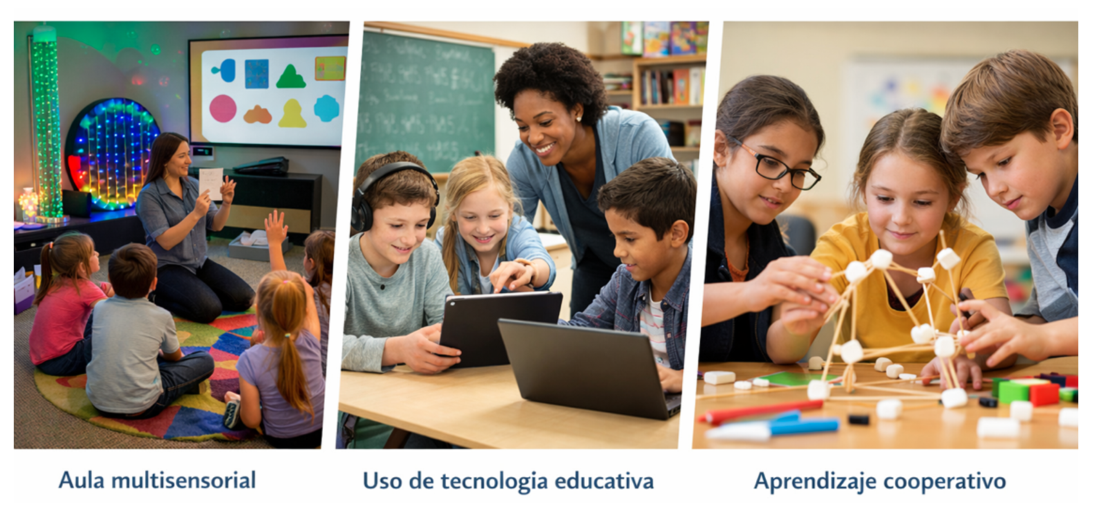 La figura anterior ilustra ejemplos de entornos de aprendizaje inclusivos donde se integran recursos multisensoriales y tecnológicos, estos espacios promueven la participación y el desarrollo de habilidades cognitivas mediante experiencias significativas y contextualizadas.