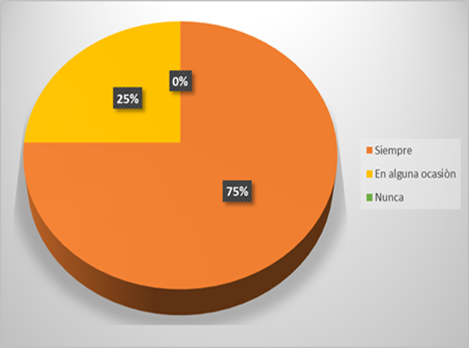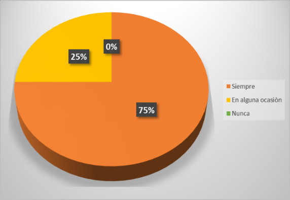 En cuanto los resultados de la figura 3, las dificultades para la integración de los estudiantes con NEE, muestra que un 75% de los docentes consideran que siempre han enfrentado dificultades en el proceso de inclusión. En contraste, con un 25% que en algunas ocasiones han afrontado problemas en este aspecto.