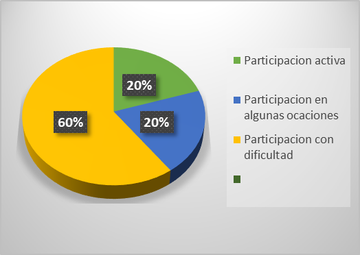 Como se puede apreciar en la figura 5, el 20% de los alumnos demostraron una participación activa en las actividades, otro 20% tiene una participación activa en ocasiones, mientras que el 60% manifiesta tener dificultad para la participación.