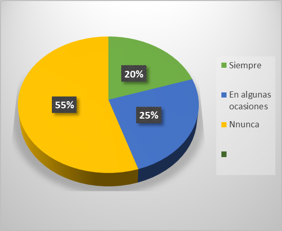 Finalmente, como puede observarse en la figura 6, el 55% de los docentes nunca han hecho uso de las danzas como una estrategia metodológica para activar la participaciόn de los estudiantẹs NEE en aula, mientras que un 25% siempre la utilizan y un 25% en algunas ocasiones lo hace.