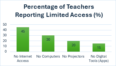 Among these, the most critical ones identified included a deficiency regarding access to technological resources such as the Internet, computers, and projectors. In this regard, data indicated that 45% of public-school teachers reported no access to reliable internet, and 30% lacked computers for classroom use. These resource limitations directly translate into limits within the instructors' ability to adopt innovative, modern instructional strategies with digital tools, thus limiting the opportunities of students to be engaged and learn. Contrarywise, private schools show a better situation in terms of access to resources, thereby underlining the difference between public and private educational institutions.