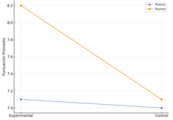 Al momento de la aplicación del postest, se registró un incremento significativo en el rendimiento académico del grupo experimental (M = 8.2, DE = 0.9), en comparación con el grupo de control (M = 7.1, DE = 1.1). Con estos datos obtenidos, se procedió a la aplicación de la prueba t de Student, la misma que confirmó que esta diferencia fue estadísticamente significativa (t = 3.21, p < .01), lo que sugiere un efecto positivo de la retroalimentación digital en el aprendizaje.
