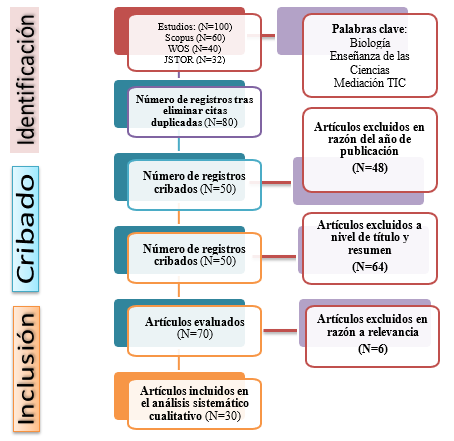 La triangulación se emplea para hacer un análisis de los datos, utilizando diferentes técnicas y desde diversos ángulos (Hernández et al., 2018). El análisis de la literatura permite identificar una brecha en la investigación relacionada con la equidad en el acceso a las TIC en contextos rurales. A pesar de los avances en tecnología educativa, la falta de infraestructura y formación docente sigue siendo un desafío importante. La presente investigación busca contribuir a este campo explorando estrategias para optimizar el uso de herramientas digitales en la enseñanza de las ciencias naturales en contextos vulnerables. En este caso de un total de 100 estudios identificados, se seleccionaron 30 en función de los siguientes criterios:
