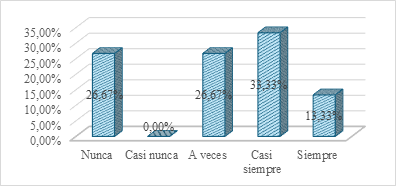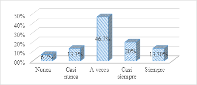 De los docentes que participaron, el 26.67% mencionó que nunca utiliza herramientas digitales para apoyar sus clases, otro 26.67% afirmó que a veces las usa, mientras el 33.33% señaló que casi siempre emplea recursos tecnológicos y, finalmente, el 13.3% indicó que siempre los utiliza. No hubo respuestas para la opción “casi nunca”.