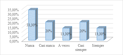 En torno al manejo de plataformas educativas, el 33.33% de los docentes reportó que nunca las utilizan, el 20% mencionó que casi nunca las manejan, el 13.30% indicó que lo hace a veces, el 20% señaló que casi siempre las emplea y finalmente un 13.3% afirmó que siempre las utiliza.
