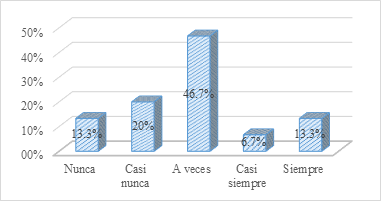 Referente al diseño de actividades o evaluaciones usando recursos digitales, el 13.3% de docentes indicó que nunca usa este tipo de herramientas en el proceso de enseñanza-aprendizaje, el 20% afirmó que casi nunca lo emplea, el 46.7% señaló que a veces lo utiliza, el 6.7% reportó que casi siempre lo integra y el 13.3% manifestó que siempre incorpora este tipo de recursos.