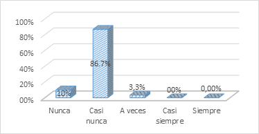 En cuanto a las herramientas digitales integradas por los docentes, el 10% de los estudiantes encuestados manifestó que sus profesores nunca emplean este tipo de recursos, el 86.7% afirmó que casi nunca lo hacen y el 3.3% reportó que solo a veces los educadores lo implementan en las clases. No hay respuestas para las opciones “casi siempre” y “siempre”.