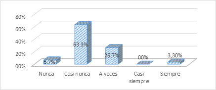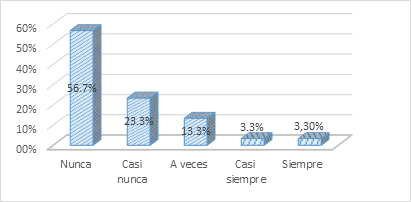 Acerca de esta interrogante, el 70% de estudiantes afirmó que los profesores nunca y casi nunca les motivan a usar la tecnología para aprender, el 26.7% manifestó que a veces lo hacen y sólo el 3.3% señaló que siempre los maestros les fomentan a utilizar herramientas digitales en su formación. No hay respuestas para la opción “casi siempre”.