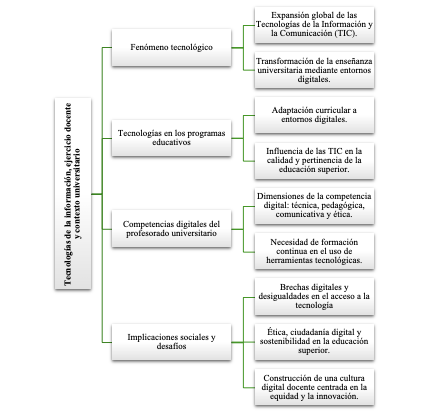 Una relación directa se presenta en la figura 1, en donde se muestra que la importancia de las tecnologías de la información en el ejercicio docente y la educación universitaria se estructura en torno a la expansión de las TIC como motor de transformación educativa y herramienta estratégica para la gestión del conocimiento, integración en los programas académicos fortalece la pertinencia y calidad del currículo universitario, uso en la enseñanza superior potencia la interacción, la autonomía y el pensamiento crítico, redefiniendo el rol docente hacia un enfoque facilitador del aprendizaje. En este marco, las competencias digitales del profesorado se consolidan como requisito esencial para una práctica pedagógica eficaz, ética y adaptativa. Además, en este proceso es necesario visualizar los desafíos vinculados con la equidad digital, la ética tecnológica y la formación de una cultura docente comprometida con la sostenibilidad y la inclusión educativa en la era digital.