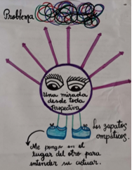 La imagen que detalla la cara de un niño lo explica la docente como: “Los ojos con flechas significan una mirada desde todas las perspectivas; los zapatos empáticos significan ponerse en el lugar del otro para entender su forma de actuar”. (Docente 3. I.E. Normal Superior), promover este comportamiento inclusivo entre estudiantes y padres de familia es también una actitud asumida por los docentes, considerada necesaria para poder sembrar una inclusión realmente consolidada a través de la cual se cubran todos los escenarios de participación de los estudiantes. Que la inclusión sea un propósito en el que todos participan sin excepción.