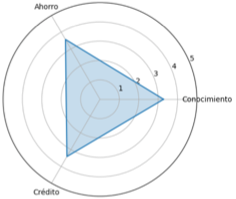 En la dimensión conocimiento financiero, los estudiantes obtuvieron una media de M = 3.28 (DE = 0.64); se observó que los ítems relacionados con comprensión de tasas de interés e inflación presentaron mayores dificultades, especialmente en la interpretación de escenarios de endeudamiento a mediano plazo.