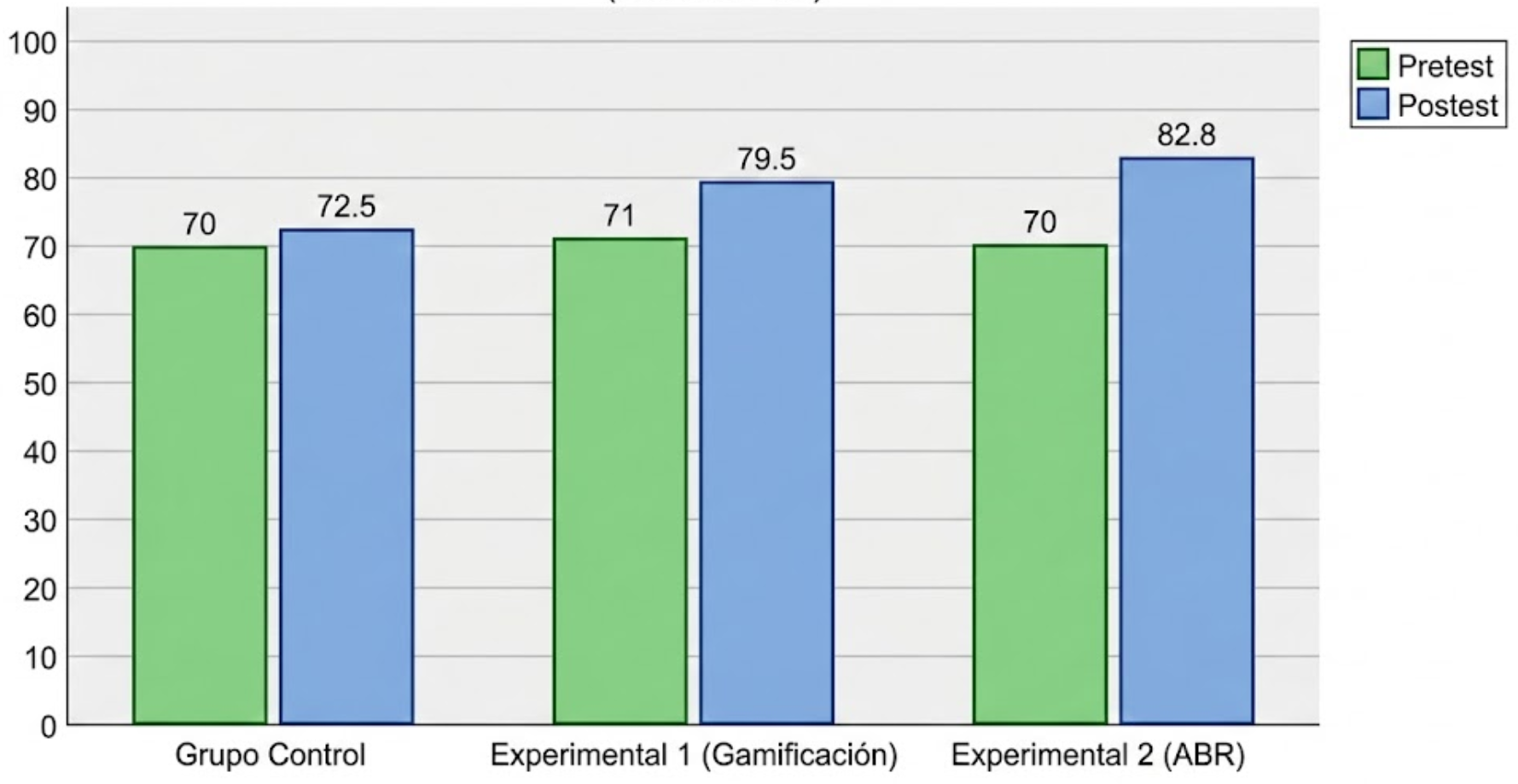 En el análisis descriptivo inicial, los promedios del pretest fueron similares entre los grupos: grupo control (M ≈ 70), grupo gamificación (M ≈ 71) y grupo ABR (M ≈ 70), lo que evidencia homogeneidad inicial en el nivel académico. Esta equivalencia permitió asumir condiciones comparables antes de la intervención pedagógica.