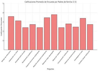 La gráfica muestra las calificaciones promedio de una encuesta aplicada a padres de familia, con una escala de 1 a 5. A continuación, se presenta un análisis de los resultados: